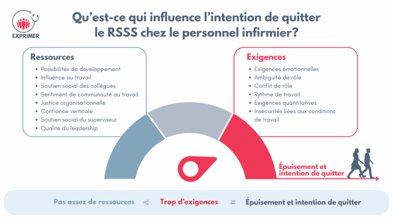 Le Projet EXPRIMER offre des pistes de réflexion quant aux leviers potentiels d’intervention pour favoriser la rétention du personnel infirmier québécois. Il met notamment en évidence le rôle du déséquilibre entre les exigences et les ressources au travail dans l’épuisement professionnel et l’intention de quitter. Globalement, il importe de limiter les exigences et de préserver les ressources. Les principales exigences rencontrées par le participant(e)s d’EXPRIMER sont le rythme de travail, les exigences émotionnelles et les conflits de rôles. Les ressources les plus présentes sont les possibilités de développement professionnel, le sentiment de communauté au travail et le soutien social des collègues. Évidemment, les personnes qui se retrouvent avec dans un travail qui comporte des demandes élevées, mais offre peu de ressources sont à risque d’épuisement professionnel…ce qui mène souvent à l’intention de quitter son emploi.